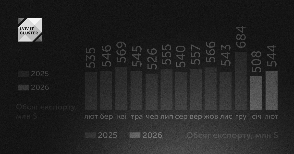 У лютому 2026 року обсяг експорту ІТ-послуг України склав $544 мільйони, згідно з даними НБУ. Це принесло українській економіці на 7,1% або $36 млн більше порівняно з січнем 2026 року.