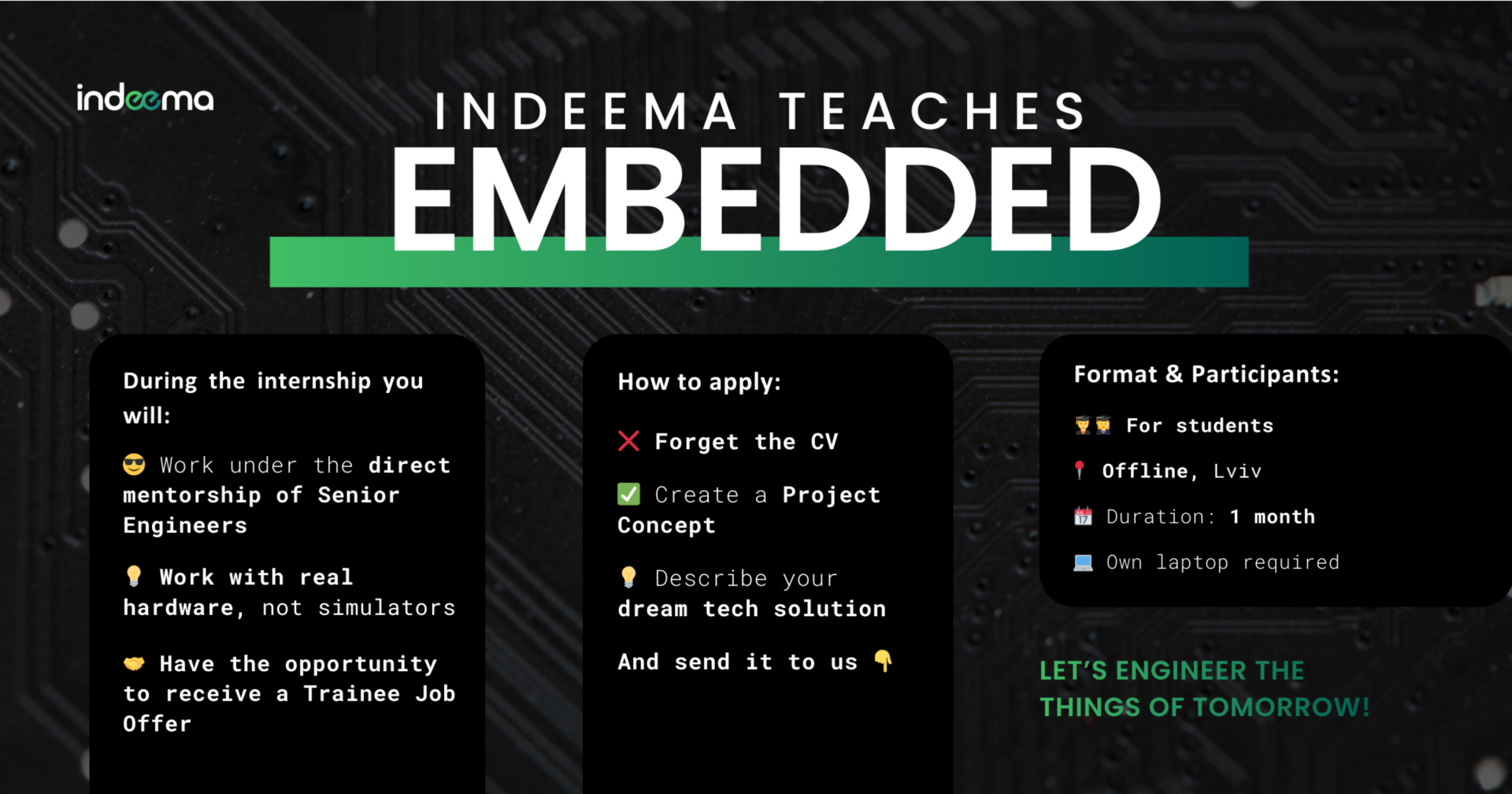Indeema, an expert in developing Internet of Things (IoT) solutions and complex engineering systems, announces the start of recruitment for the “Indeema Teaches Embedded” training program. This is a bootcamp-style training designed for technical students who strive to transition from university theory to real work with hardware.