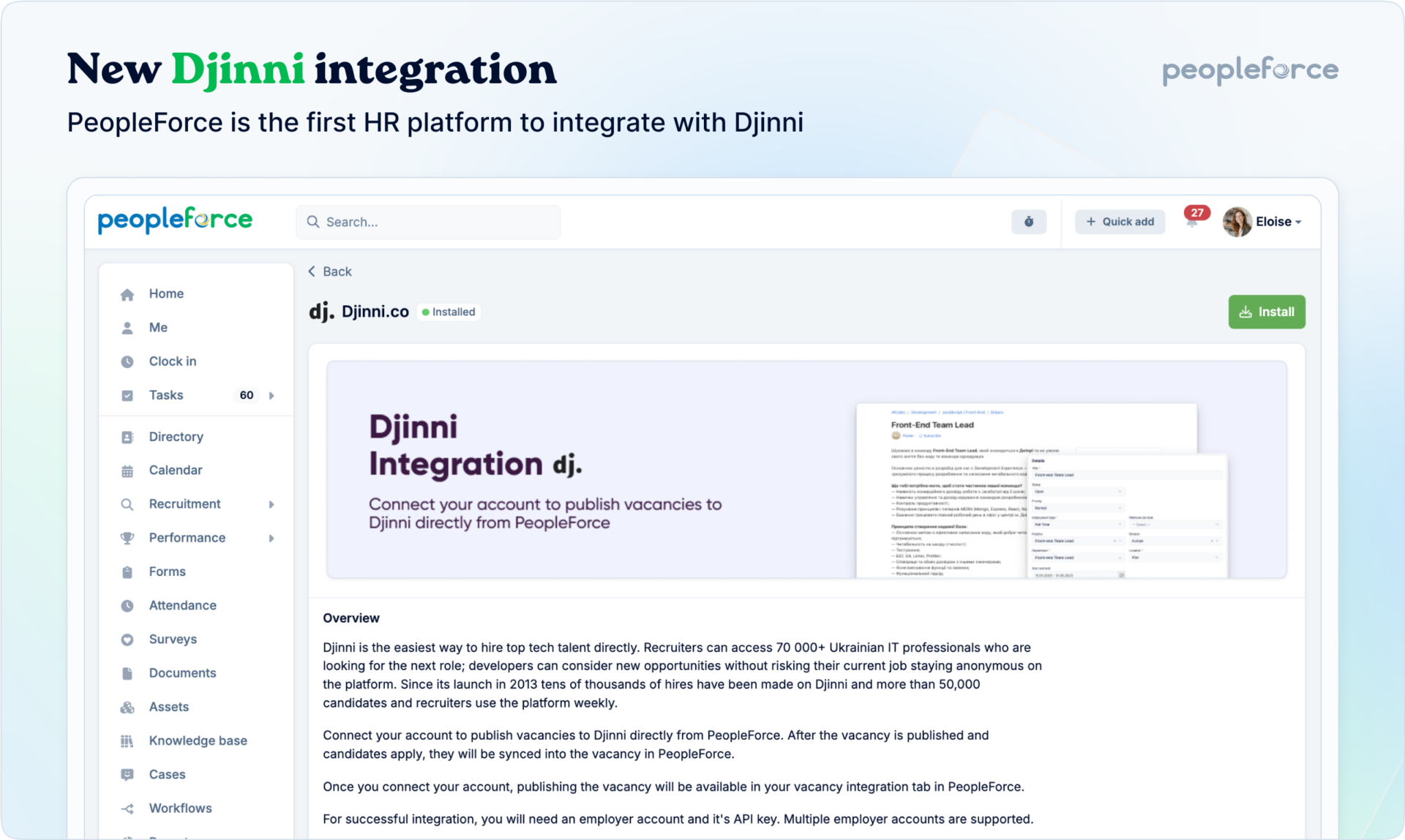 PeopleForce, a leading all-in-one HR platform in the Ukrainian market, is the first HRM to integrate with Djinni, Ukraine’s largest tech job marketplace. This powerful alliance was designed as a natural response to the needs of the recruitment market.
