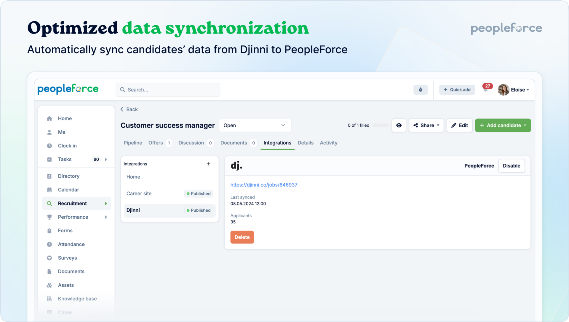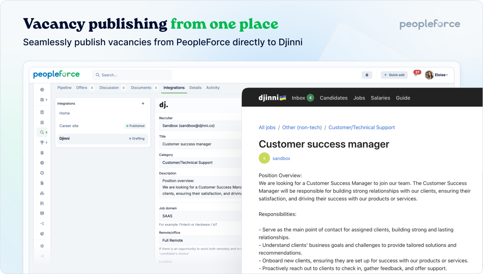 “Seamlessly syncing candidate data from Djinni to PeopleForce empowers our users to manage their recruitment processes entirely within one solution. This way, we’re contributing to the entire HR tech landscape and delivering on our mission to make PeopleForce a one-stop shop for all HR and recruitment needs,” says Andrew Cetinic, CEO at PeopleForce.