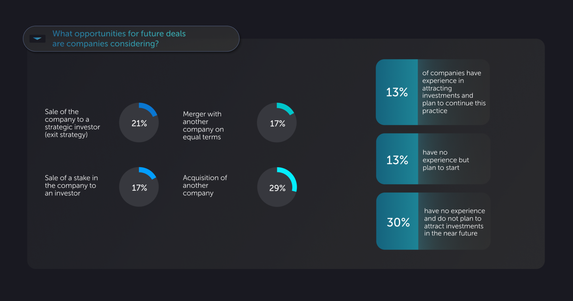 Most Ukrainian tech companies have stabilized after the challenges of recent years and are actively seeking paths for further growth. 13% of companies have experience attracting investment and plan to continue; another 13% — have not worked with investors before but plan to start; 30% — have no experience and do not plan to raise funding soon.