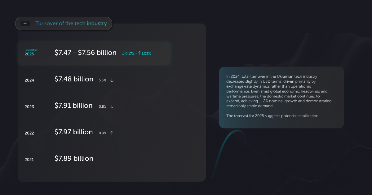 As for specialists working in the tech industry, their number remains nearly the same as last year — 303,000 professionals. Among them, 245,000 live and work in Ukraine — 2.9% more than in 2024.