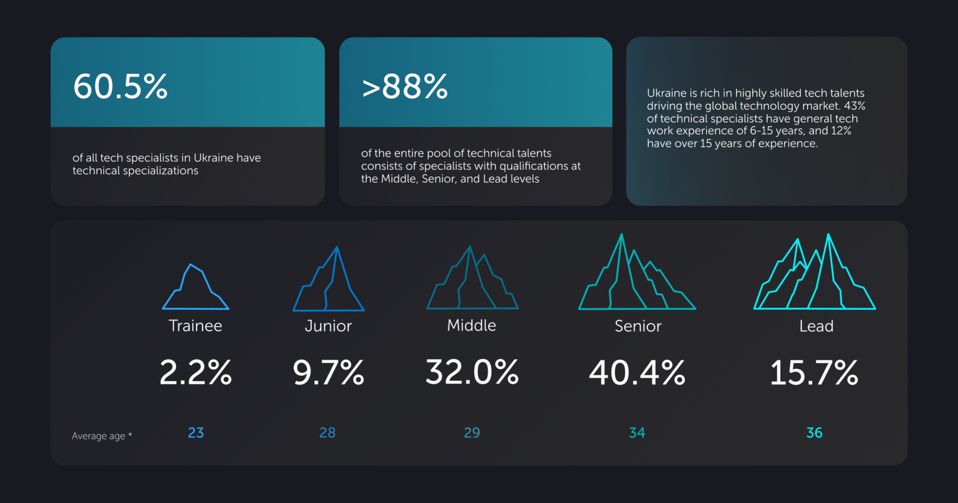 Ukraine has a strong pool of highly qualified tech talent driving the global technology market. Among technical specialists, 43% have 6–15 years of experience, and 12% — more than 15 years. Over 88% of the entire technical talent pool are Middle, Senior, and Lead specialists.