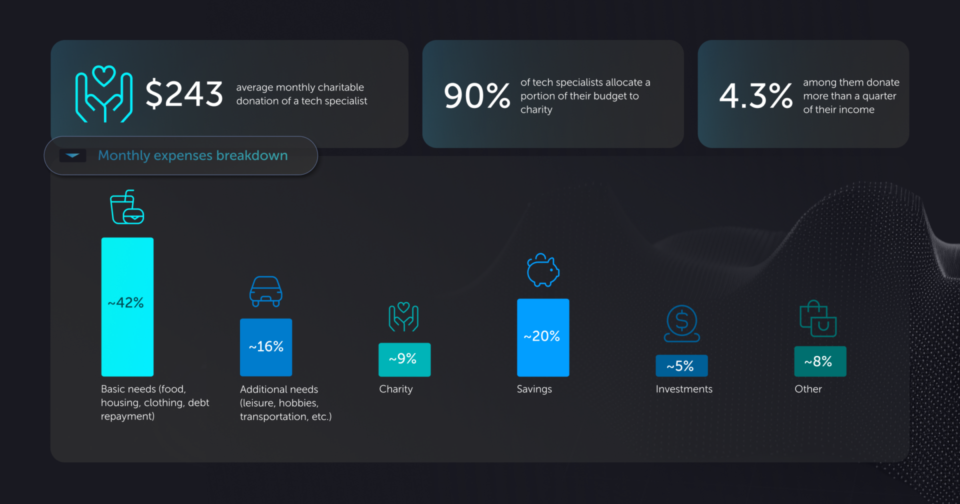 90% of tech specialists donate part of their budget to charity. Among them, 4.3% donate more than a quarter of their income. The average monthly charitable contribution of one tech specialist increased to $243, compared to $235 last year.