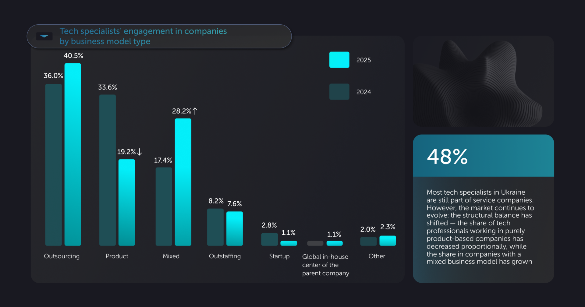 The majority — 48% of Ukrainian tech specialists — are still working in service companies. However, the market continues to shift: the share of specialists working in product companies declined relatively — from 33.6% to 19.2%, while those in mixed-model companies increased — from 17.4% to 28.2%.