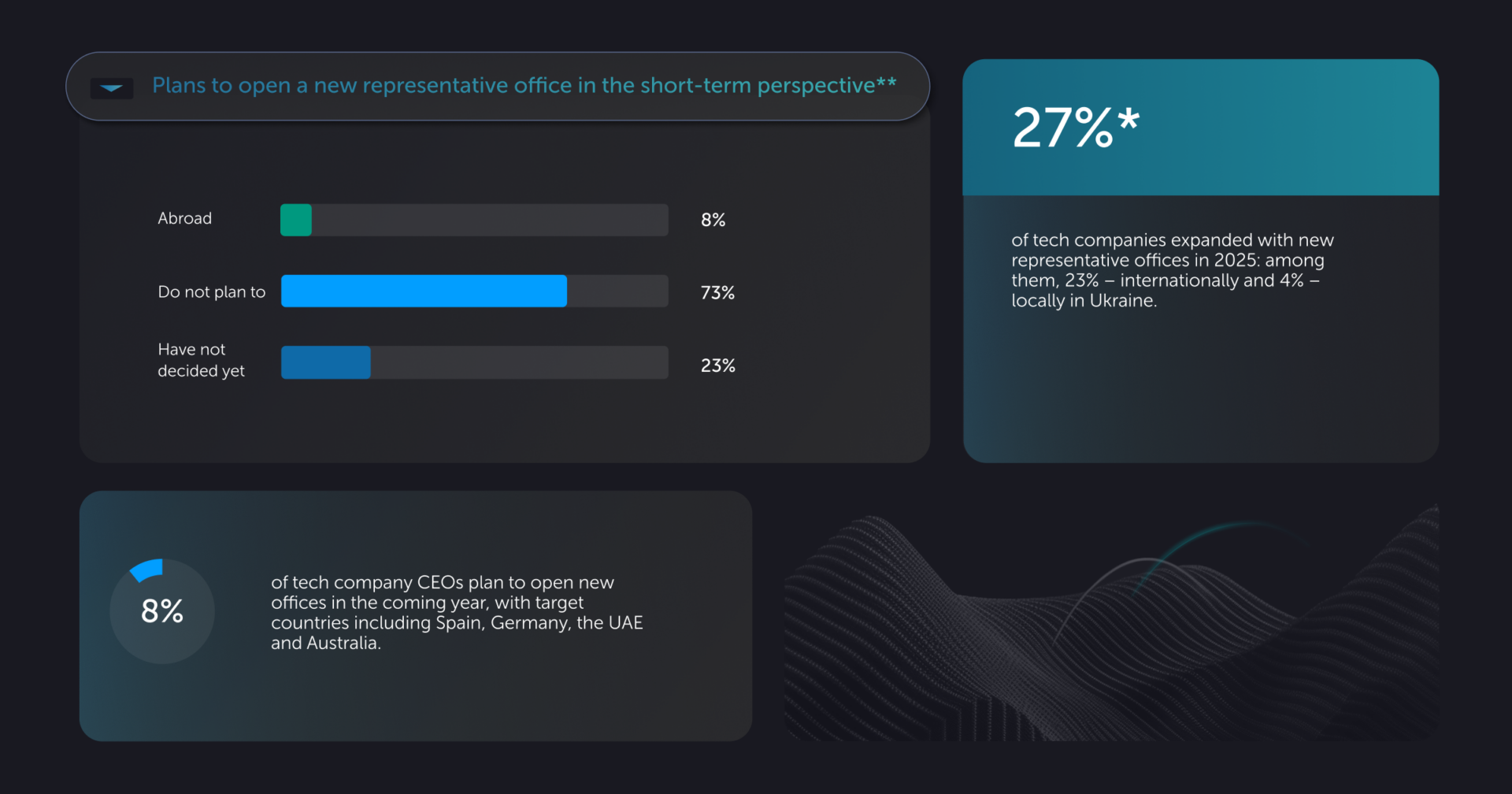 27% of tech companies expanded with new representative offices in 2025: among them, 23% — internationally and 4% — locally in Ukraine. 8% of tech company CEOs plan to open new offices in the coming year, with target countries including Spain, Germany, the UAE and Australia.