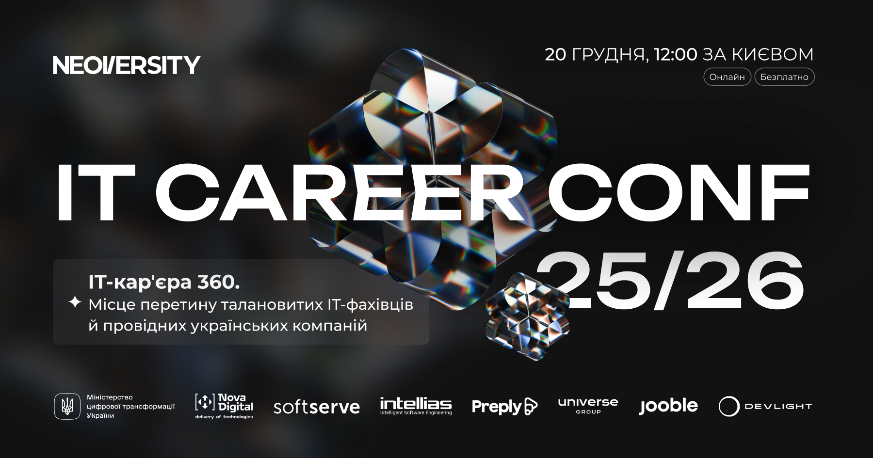 20 грудня відбудеться IT Career Conf 25/26 — найбільша онлайн-конференція про IT-кар’єру в Україні, яка об’єднає понад 10 000 учасників та 10+ провідних технологічних компаній. Організатор — онлайн IT-університет Neoversity.