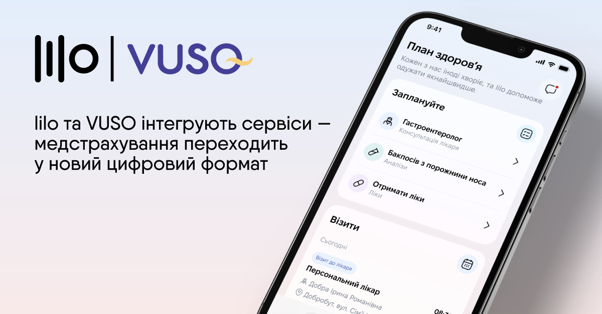 Цифровий продукт lilo та страхова компанія VUSO інтегрують свої сервіси. Це партнерство змінює формат взаємодії клієнта зі страховою на практичному рівні та забезпечує більш швидкий, максимально диджиталізований та безшовний досвід. Клієнти медстрахування СК VUSO отримали доступ до цифрового сервісу, завдяки чому зможуть взаємодіяти з лікарями та лабораторіями швидше, зберігати всі медичні дані у застосунку, мати персонального лікаря та чекапи.