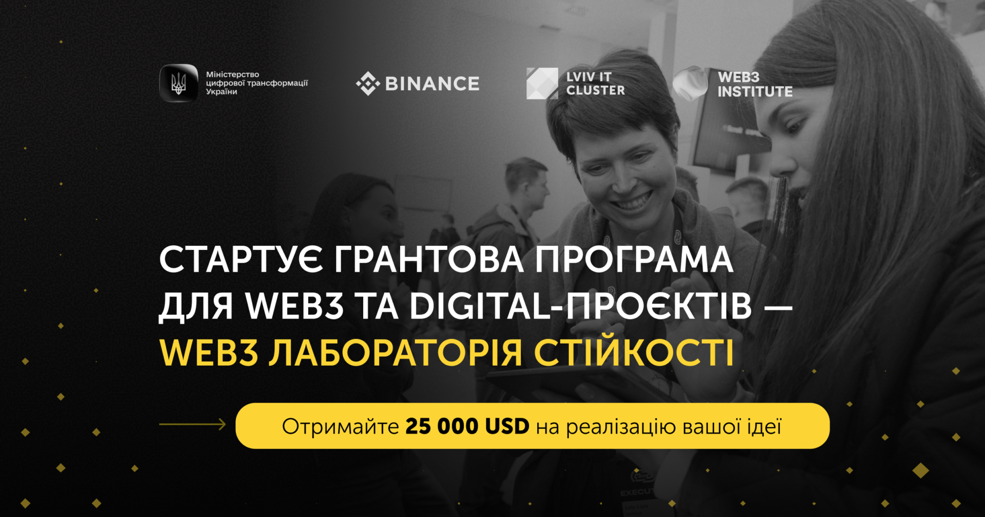 Міністерство цифрової трансформації України, Binance та Львівський ІТ Кластер спільно з Web3 Institute об’єдналися для створення Web3 Лабораторії Стійкості. Це нова всеукраїнська програма, яка покликана прискорити розвиток інновацій, які роблять країну сильнішою. Вона спрямована на підтримку цифрових ідей на ранніх етапах розвитку з можливістю залучити фінансування на їхню реалізацію: загальний грантовий фонд ініціативи становить до $500 000.