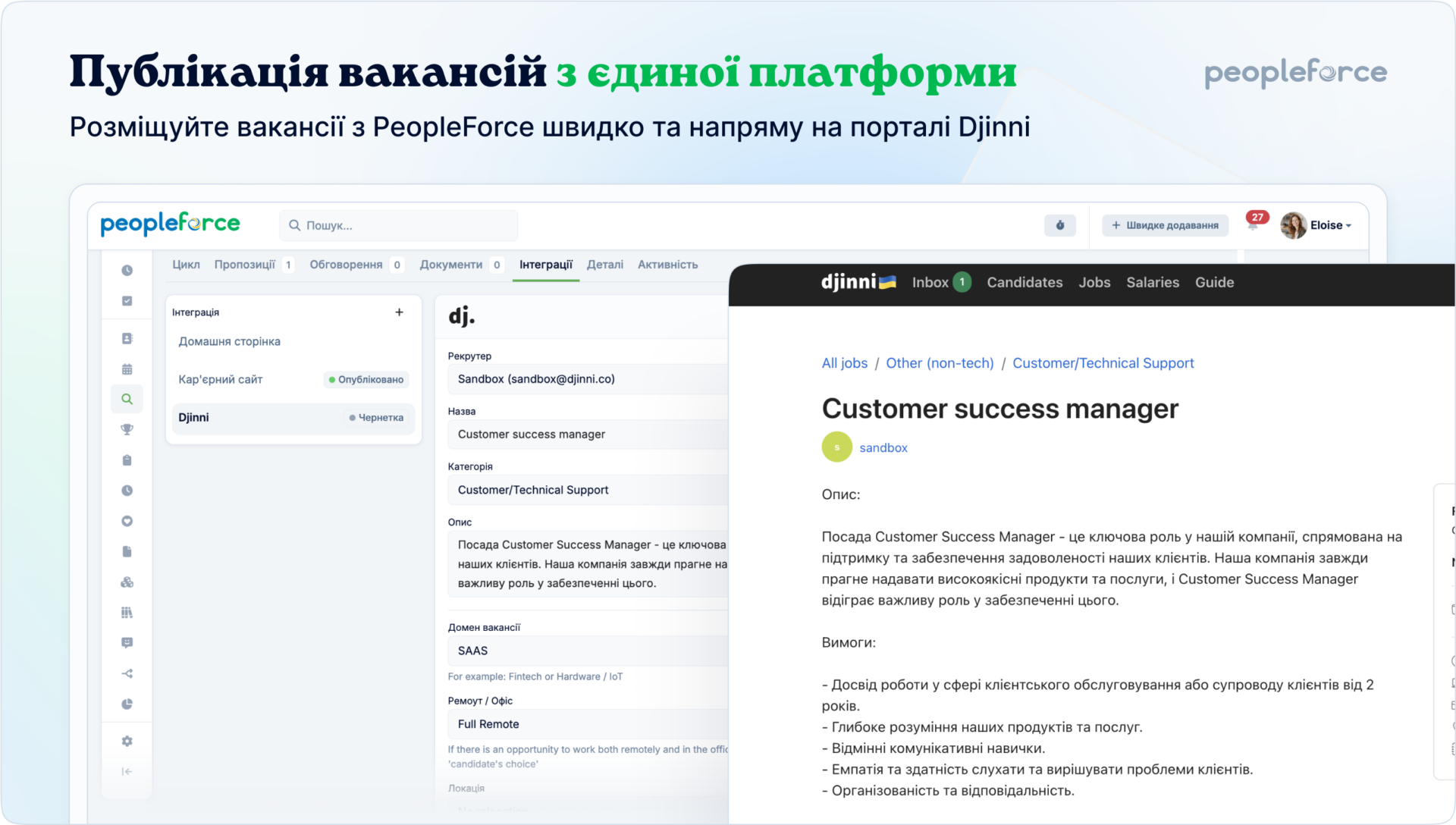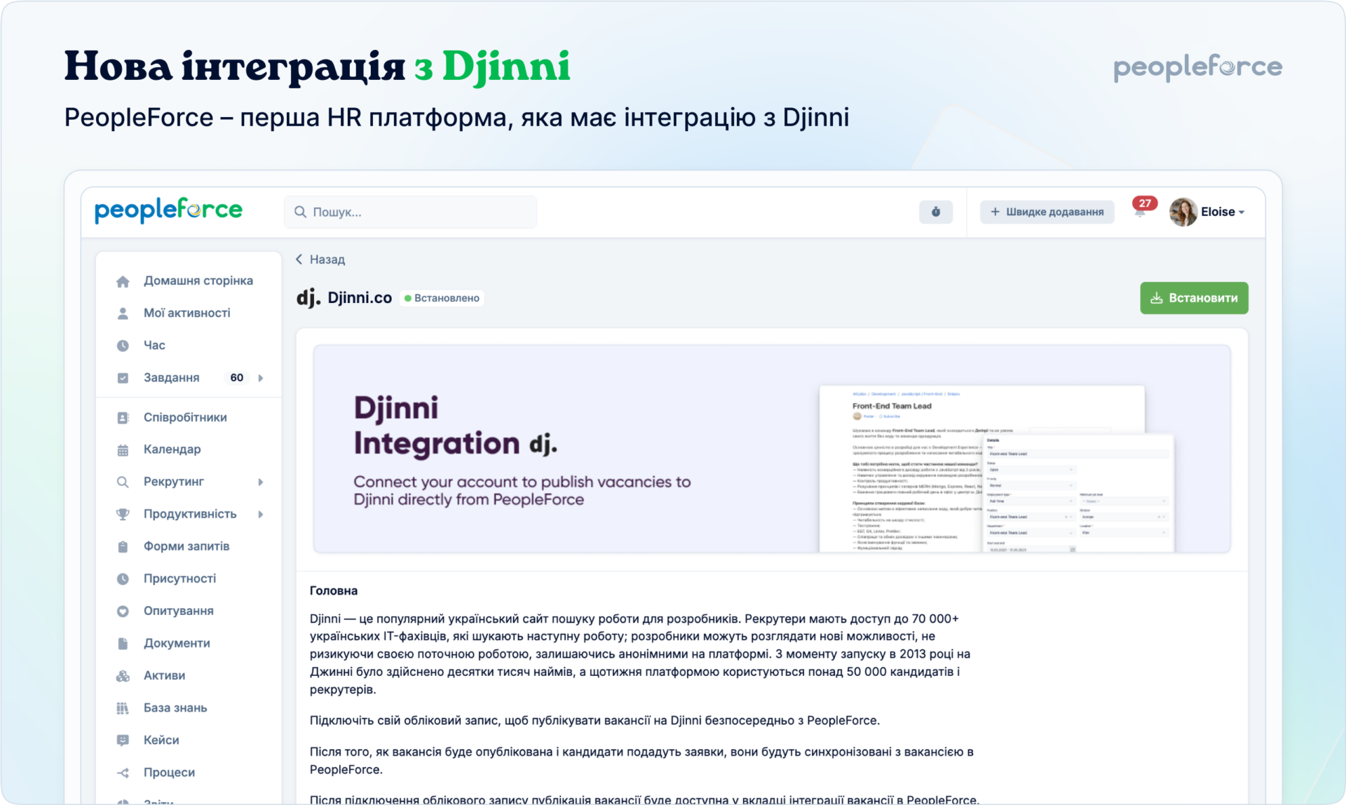 Провідна HR платформа PeopleForce першою на українському ринку запустила інтеграцію з Djinni, найбільшим сайтом пошуку роботи для технічних спеціалістів. Представники компаній зазначили, що це партнерство є логічним відгуком на потреби у галузі рекрутингу та найму.