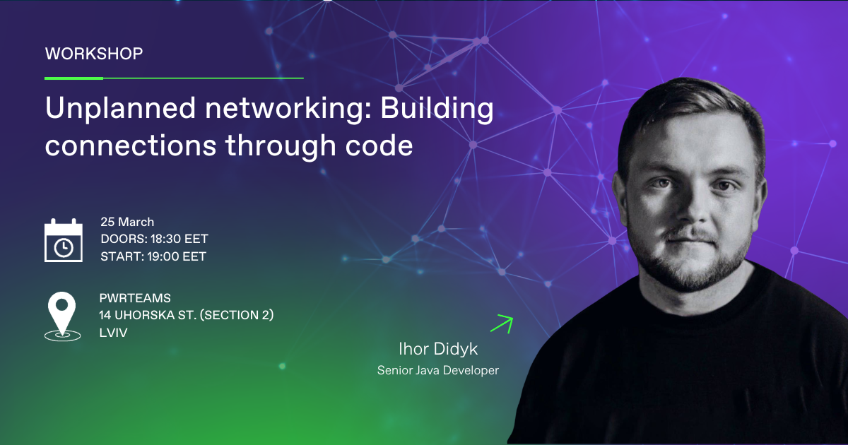Спікером заходу стане Ігор Дідик, Senior Java Developer у Pwrteams Ukraine. Він поділиться історією про те, як підготовка до технічного вебінару переросла у масштабнішу технічну ініціативу та сприяла формуванню професійного кола контактів. Замість класичних порад про «ефективний нетворкінг» учасники почують про те, як код, open-source внески та щирий інтерес до технологій можуть природно створювати видимість і відкривати нові можливості.