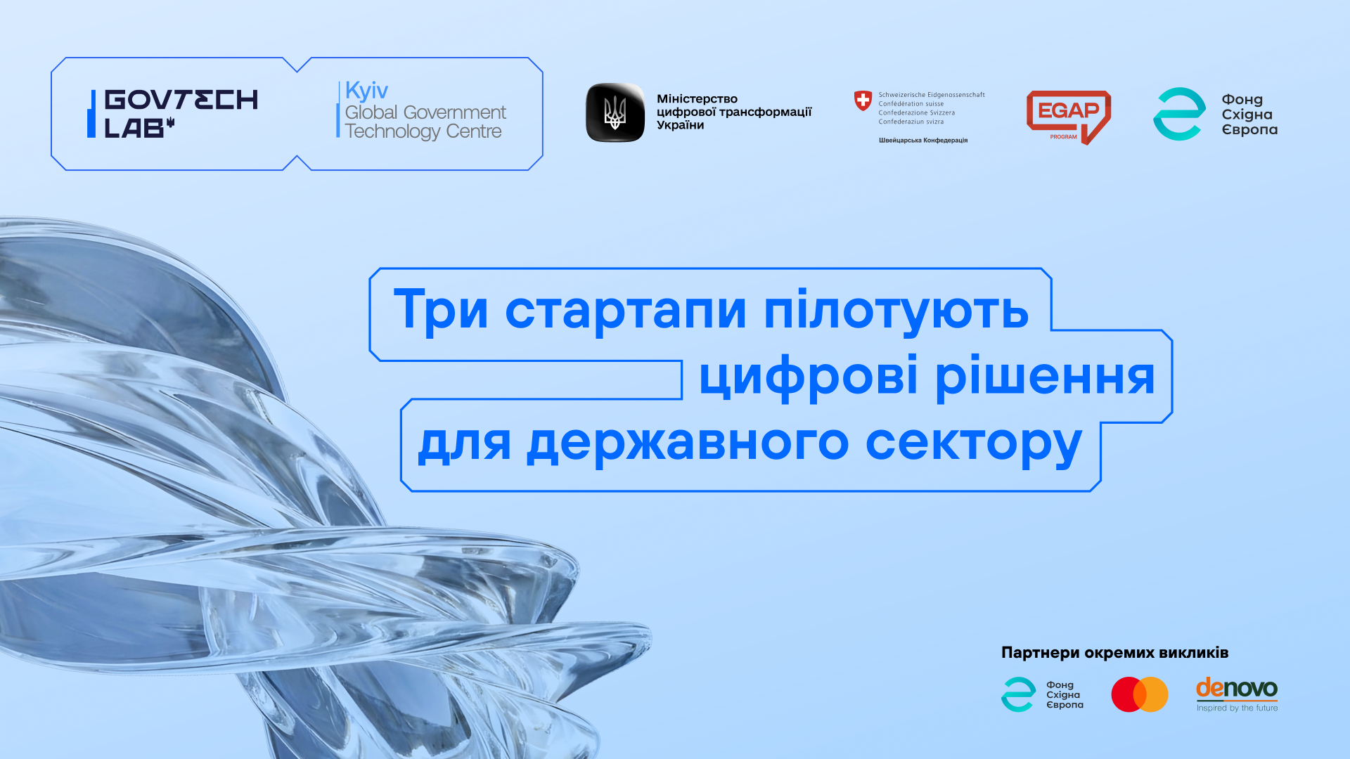 Підтримку окремих викликів забезпечують: Mastercard — партнер виклику управління туризмом на основі даних та Фонд Східна Європа — партнер виклику автоматизованої правової допомоги. Інфраструктурні ресурси для всіх трьох викликів надає De Novo, що дає змогу командам розробляти й тестувати пілотні рішення.